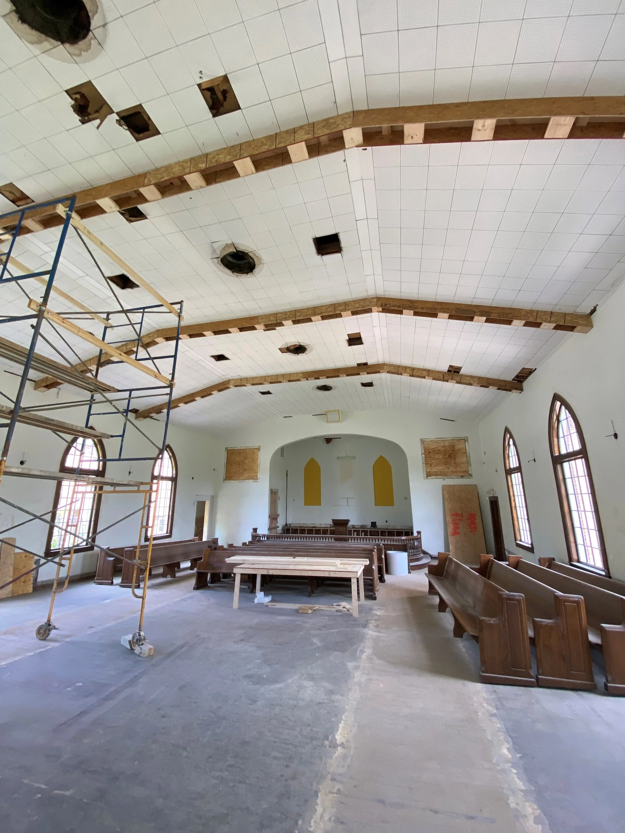 In January of 2024, we began the planned renovations to the sanctuary, first floor classrooms and offices. The 80-year-old stained glass windows were temporarily removed to be refurbished. The stained glass is being replaced with clear panes, and the frames are being restored and weatherproofed.